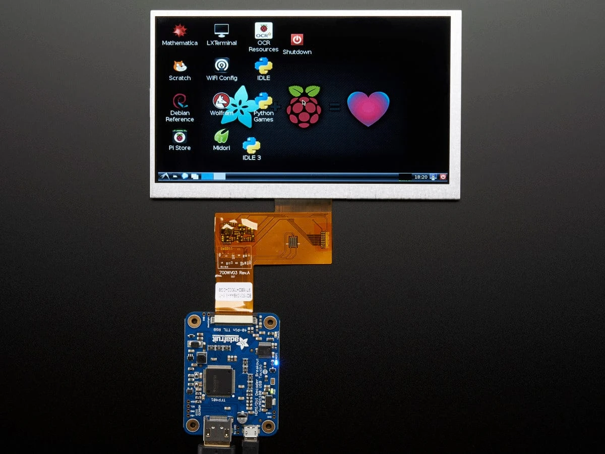 This 7.0″ TFT screen has lots of pixels, 800×480 to be exact, and an LED backlight. Its great for when you need a lot of space for graphics. These screens are commonly seen in consumer electronics, such as miniature TV’s, GPS’s, handheld games car displays, etc. A 40-pin connector has 8 red, 8 green, and 8 blue parallel pins, for 24 bit color capability.