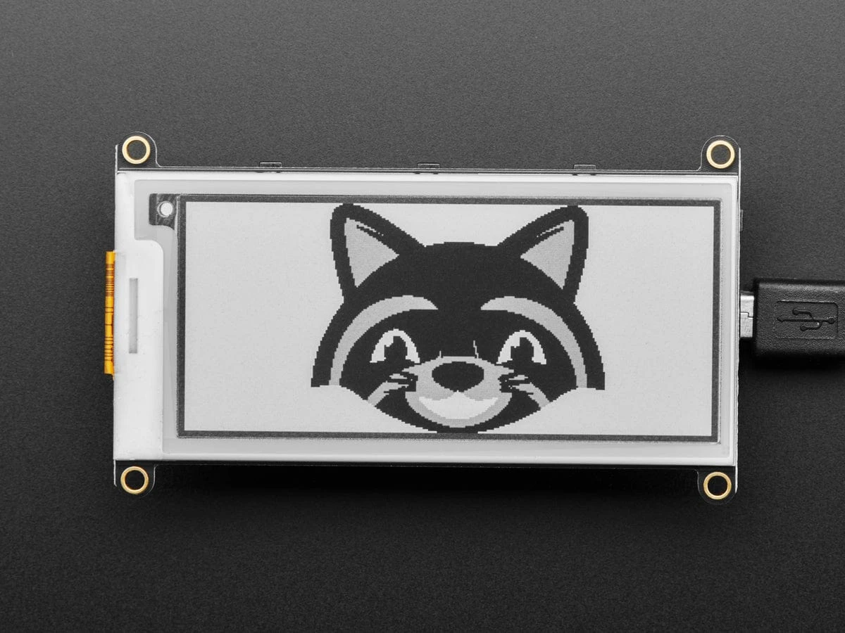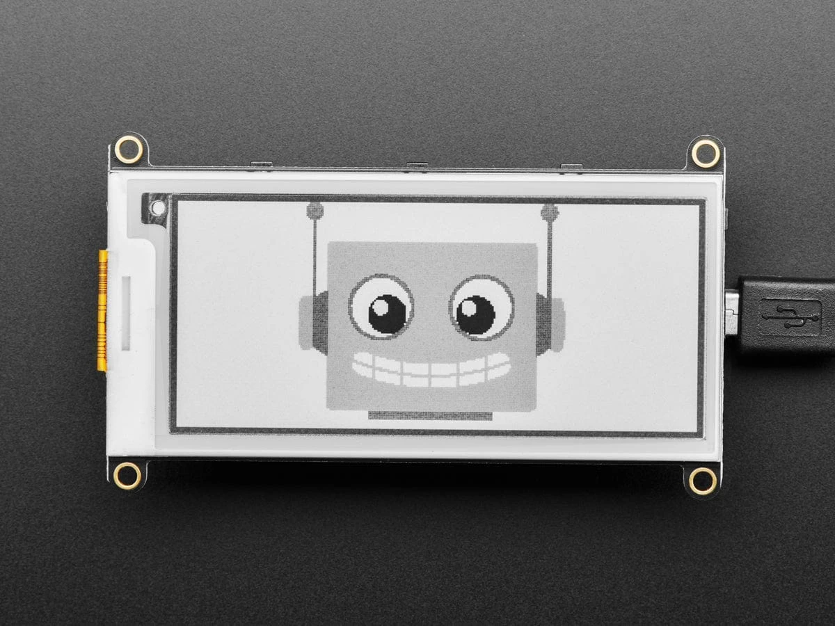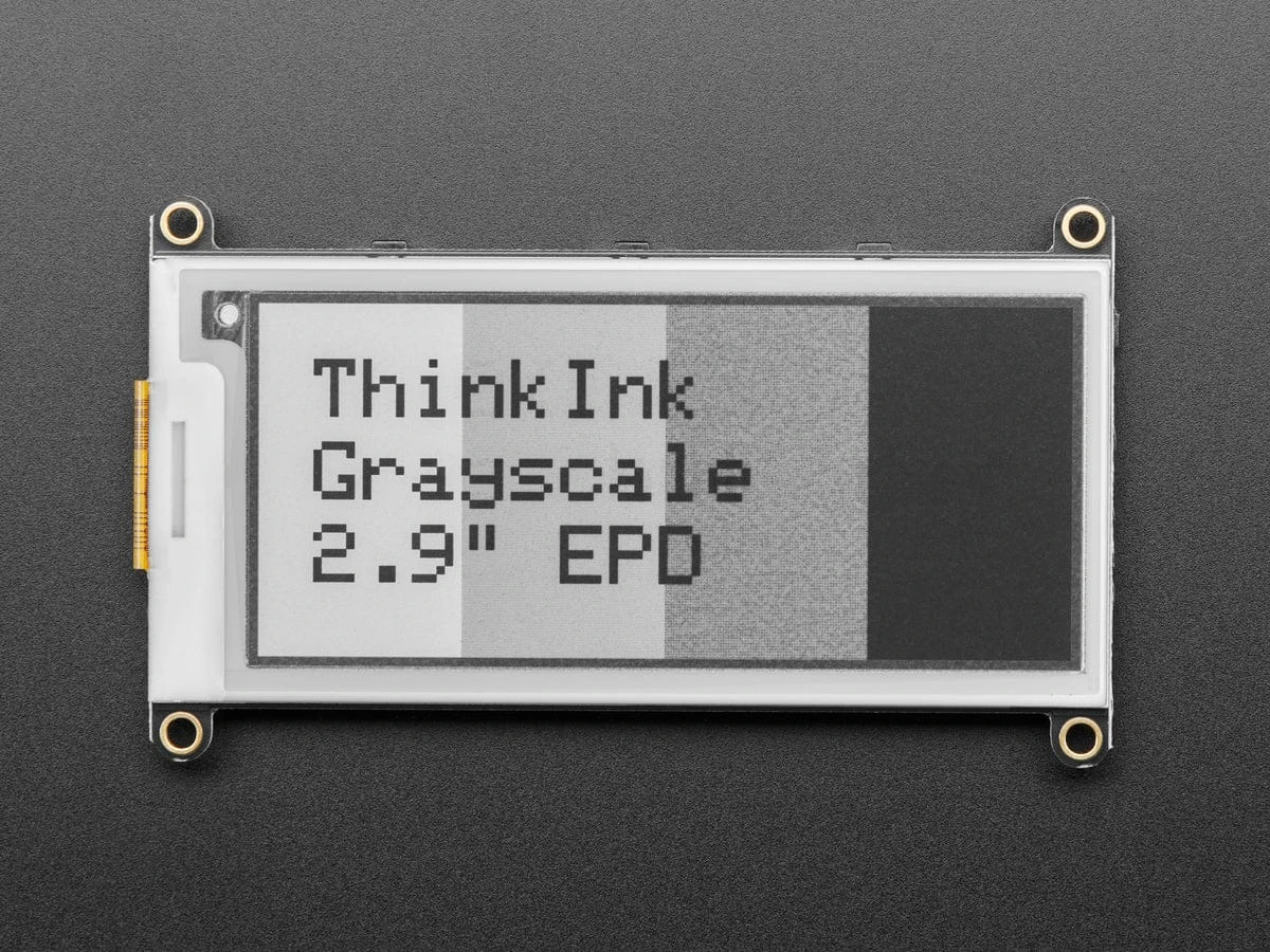 The FeatherWing sports a 2.9″ grayscale display with 296×128 pixels. Each pixel can be white, light gray, dark gray or black. Compared to ‘tri-color’ displays with a red pigment, this display takes a lot less time to update, only about a second instead of 15 seconds!