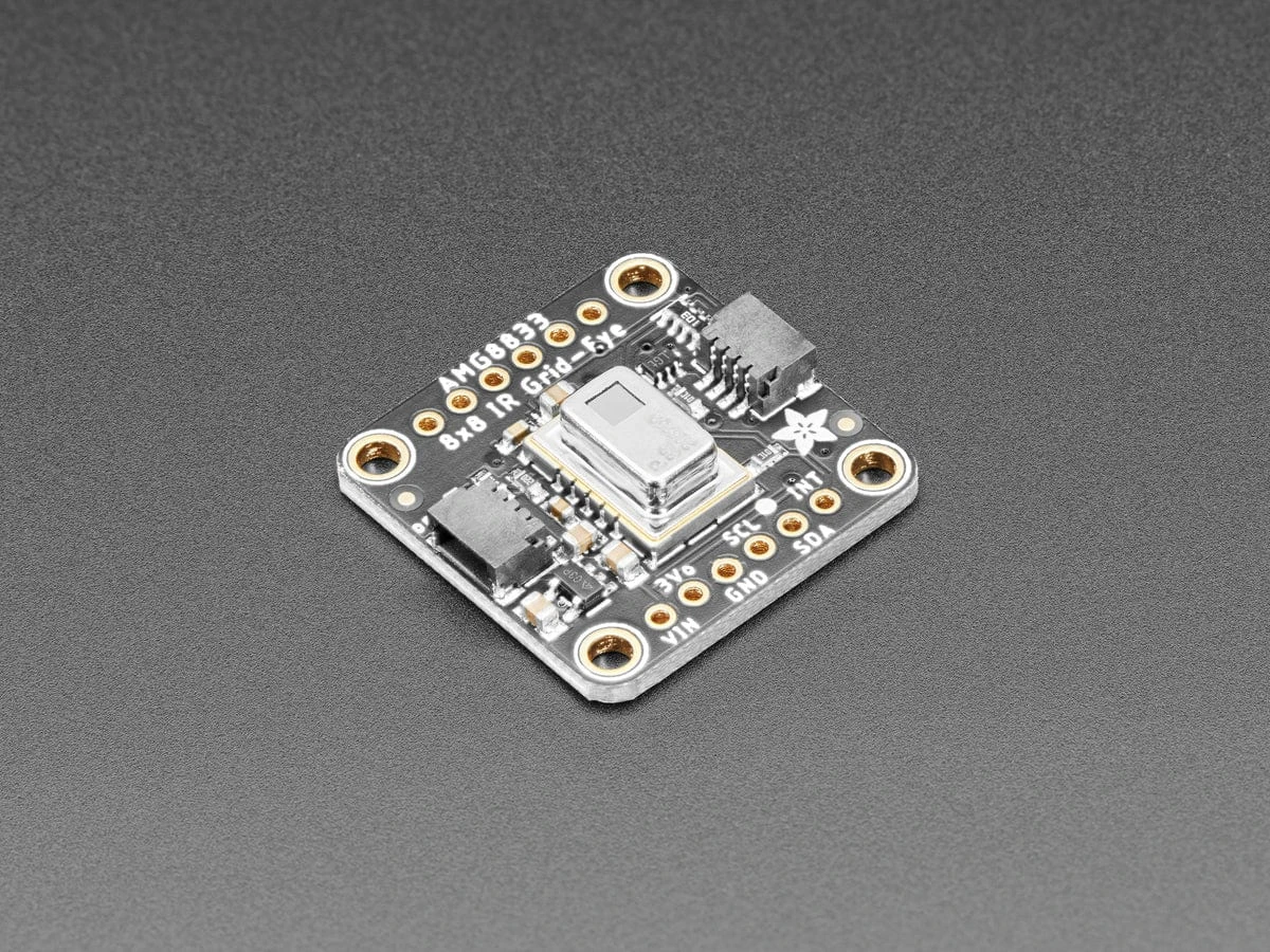 Add heat-vision to your project and with an Adafruit AMG8833 Grid-EYE Breakout! This sensor from Panasonic is an 8×8 array of IR thermal sensors. When connected to your microcontroller (or raspberry Pi) it will return an array of 64 individual infrared temperature readings over I2C. It’s like those fancy thermal cameras, but compact and simple enough for easy integration.