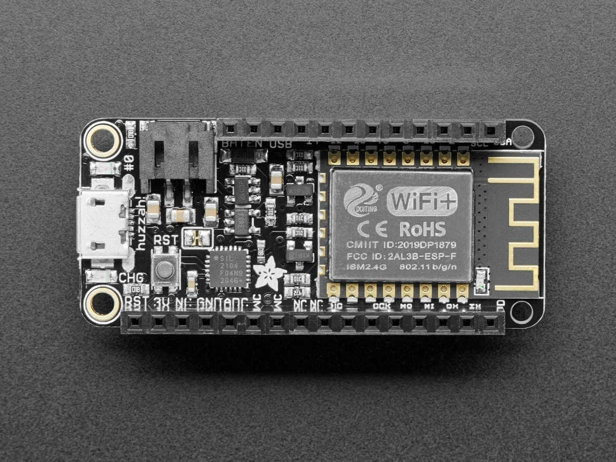 At the Feather HUZZAH’s heart is an ESP8266 WiFi microcontroller clocked at 80 MHz and at 3.3V logic. This microcontroller contains a Tensilica chip core as well as a full WiFi stack. You can program the microcontroller using the Arduino IDE for an easy-to-run Internet of Things core. We wired up a USB-Serial chip that an upload code at a blistering 921600 baud for fast development time. It also has auto-reset so no noodling with pins and reset button pressings.