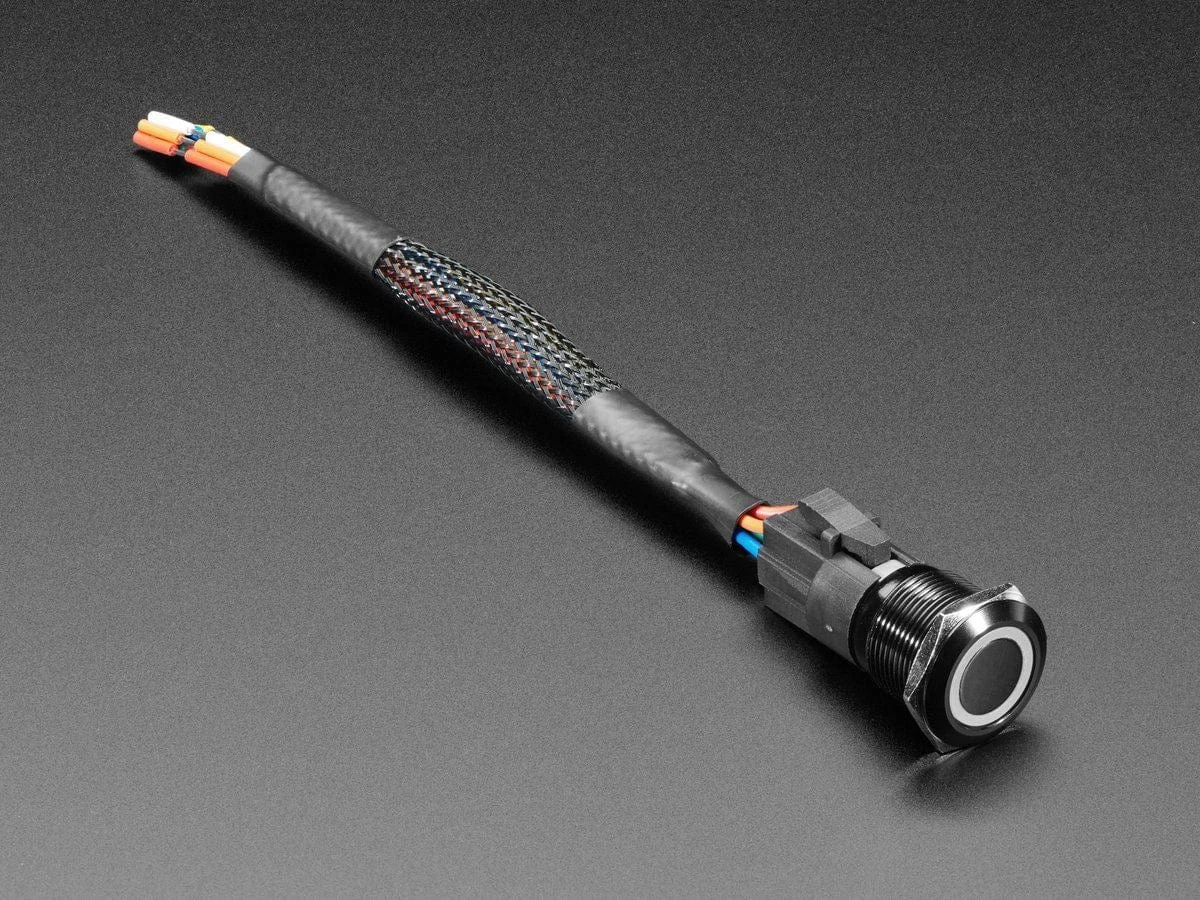 This is a 19mm Latching version of the RGB pushbutton. Simply drill a 19mm hole into any material up to 0.45″ thick and you can fit these in place – there’s even a rubber gasket to keep water out of the enclosure. On the front of the button is a flat metal actuator, surrounded by a plastic RGB LED ring.