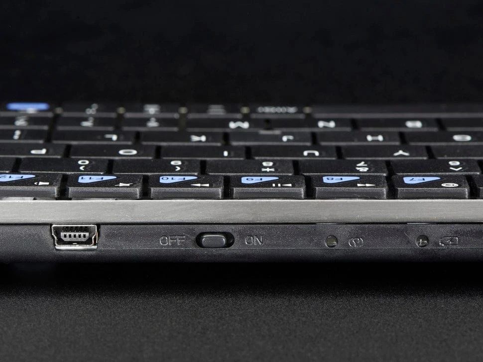 Best of all, this keyboard is just 7mm / 0.28″ thick – so it’s super slim, lightweight, and wireless. There’s a USB-A dongle in the back of the keyboard that you can just plug in and use. There’s also a mini-USB hook up in the back and a mini-USB cable that runs to a dual USB-A male & USB-Female plug. This cable works to charge the keyboard but will not send data (but you can charge it and use it wirelessly at the same time)