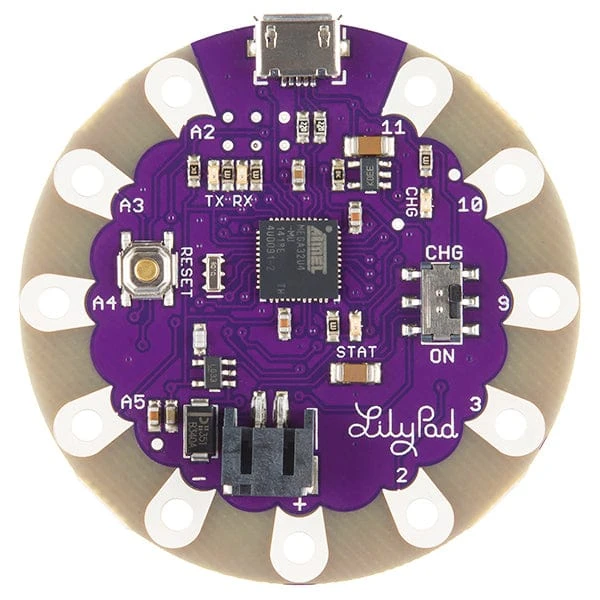 LilyPad is a wearable e-textile technology developed by Leah Buechley and cooperatively designed by Leah and SparkFun. Each LilyPad was creatively designed to have large connecting pads to allow them to be sewn into clothing. Various input, output, power, and sensor boards are available. They’re even washable!