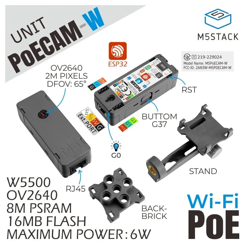 The PoE Camera is an open source, fully programmable camera, that integrates PoE (Power Over Ethernet) and Wi-Fi. This item is an ESP32 based webcam with a W5500 embedded Ethernet controller, plus a 2M pixel image sensor (OV2640). It is equipped with a combination of an 8MB PSRAM + 16MB flash memory. With this flexible power supply, you can get a stable image by connecting the network cable in just 2 steps.