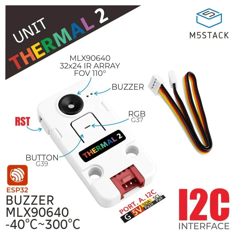 is a data processing MCU-equipped MLX90640 thermal imaging acquisition unit. It has 32×24 imaging pixels, a field of view of 110°x75° and a temperature measurement range of -40°C to 300°C.