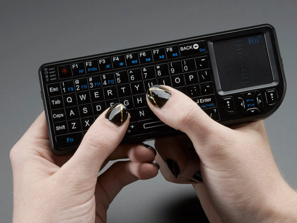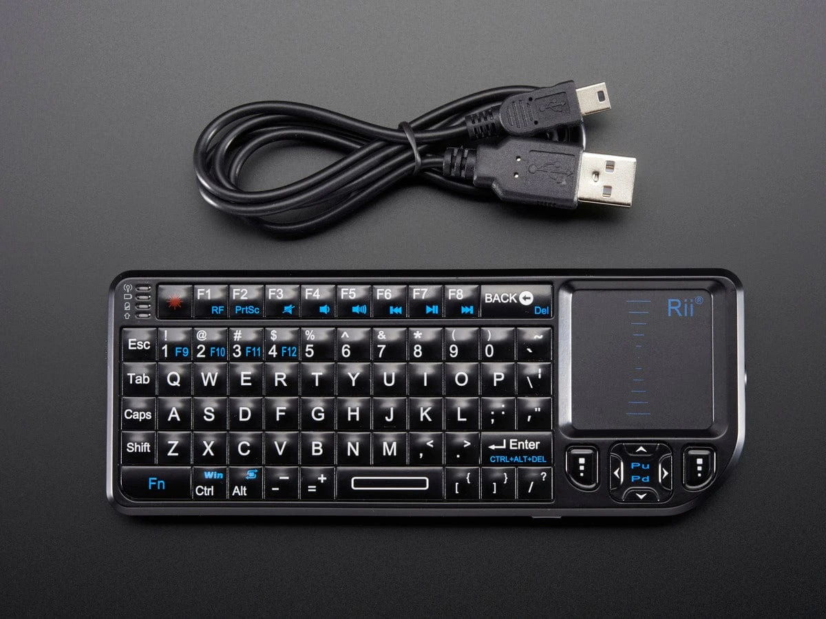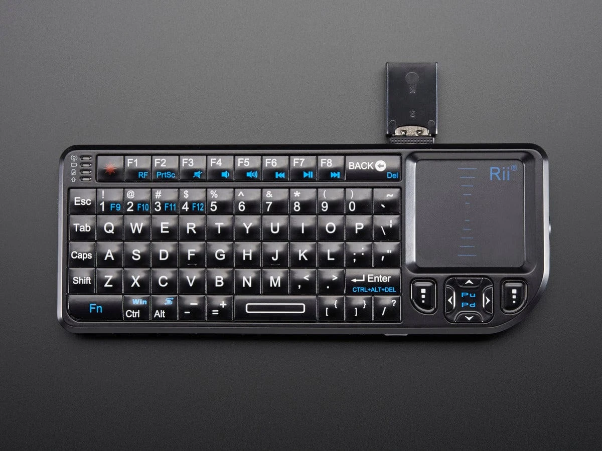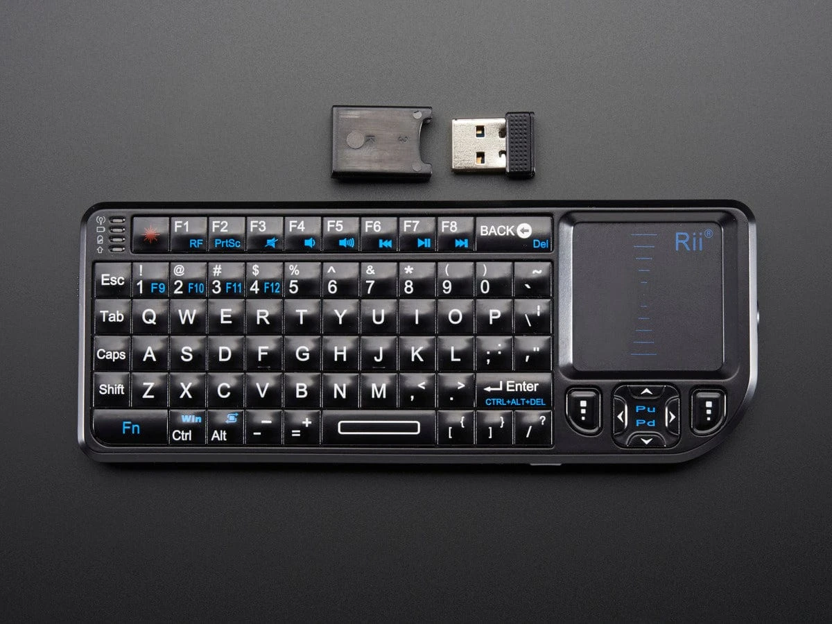 Add a miniature wireless controller to your computer project with this combination keyboard and touchpad. We found the smallest wireless USB keyboard available, a mere 6″ x 2.4″ x 0.5″ (152mm x 59mm x 12.5mm)! It’s small but usable to make a great accompaniment to a computer such as the Beagle Bone or Raspberry Pi. The keyboard itself is battery powered (there’s a rechargeable battery inside that you charge up via the included USB cable). The keyboard communicates back to the computer via 2.4 GHz wireless link (not Bluetooth)