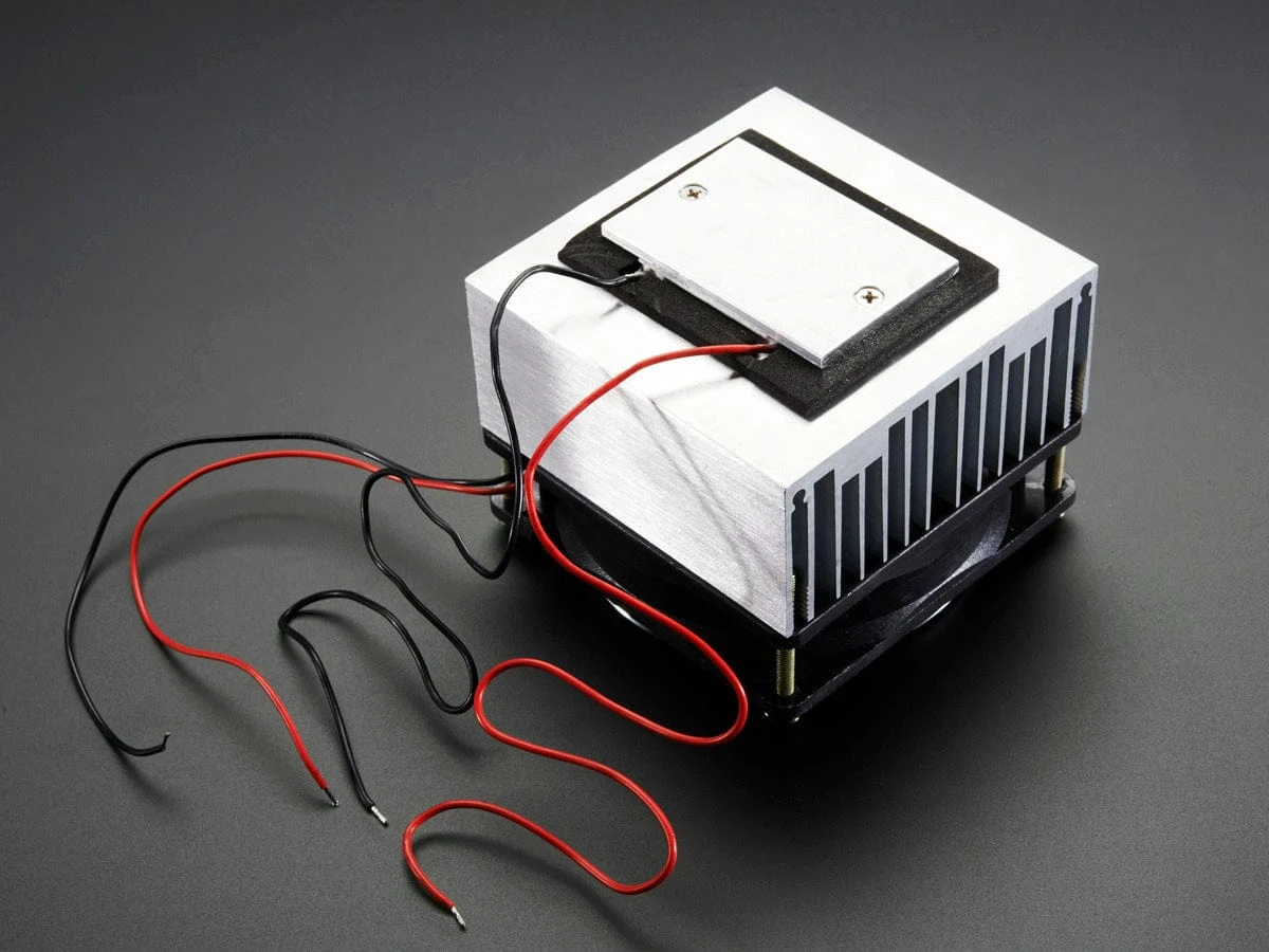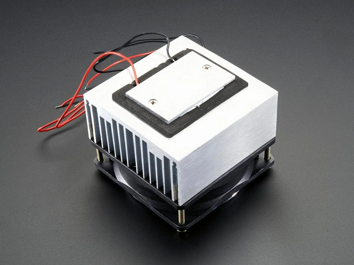 Comes with the Peltier, heatsink, fan all assembled. You’ll need a power supply to power it, we suggest our 12V 5A wall adapter. We show a temperature meter in a photo but that’s not included, its just to show you how cold it gets.