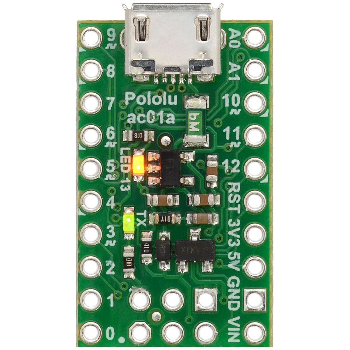 The A-Star 32U4 Micro is a tiny programmable module featuring the ATmega32U4 AVR microcontroller. It packs a Micro-USB interface and 18 digital input/output pins (of which 7 can be used as PWM outputs and 8 as analog inputs) onto a board measuring only 1″ × 0.6″ and ships preloaded with an Arduino-compatible bootloader.