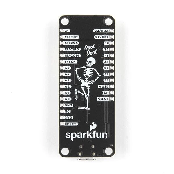 The SparkFun Thing Plus SkeleBoard features a matte black PCB with a super scary skeleton design in white silk and one of our favorite references out of the last few years (DOOT). We’ve also made sure to include a 2.4GHz U.FL PCB Antenna as well so you won’t need to worry about picking up any additional parts to get your board up and running! Other than that, this board is identical to our existing SparkFun Thing Plus – ESP32 WROOM (U.FL).