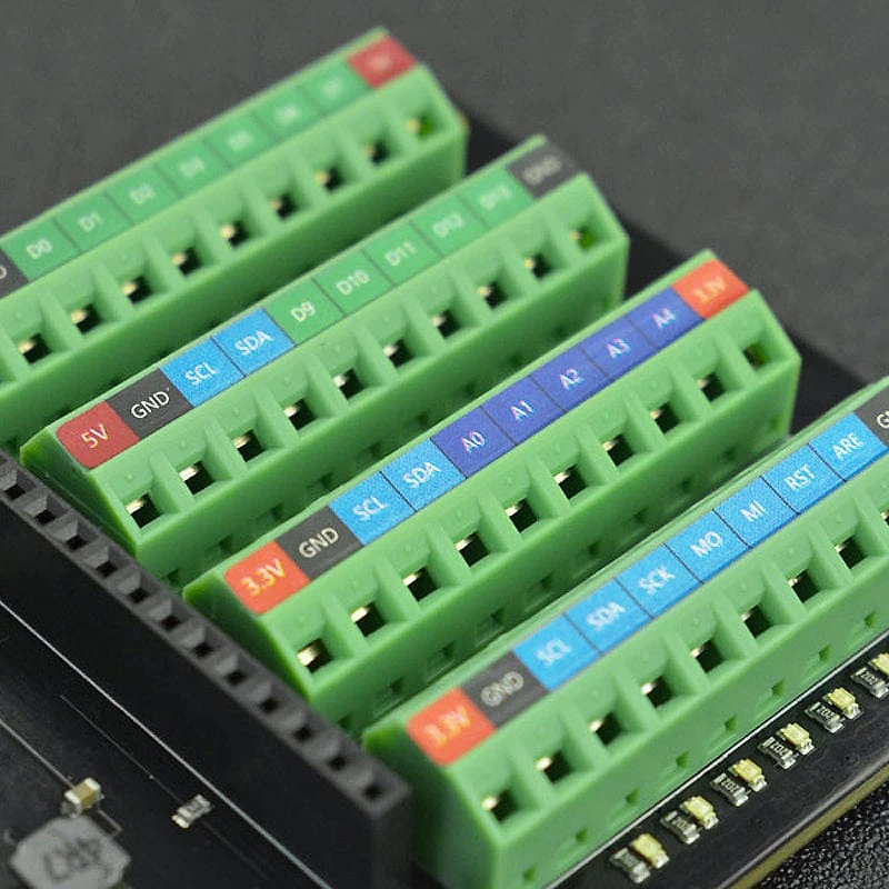 Compared with the previous shield version, this terminal block board comes with an additional 7-24V external voltage input, GDI port and adopts terminal blocks to secure wires so as to make connections more stable and reliable.