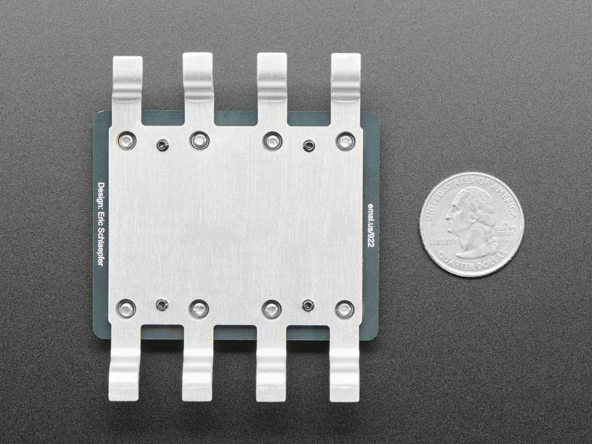 The Three Fives kit was designed by Eric Schlaepfer, in collaboration with EMSL. The kit is lovingly designed to resemble an (overgrown) integrated circuit, based around a black circuit board with clear solder mask so that you can see the wiring traces between the components. It comes complete with a beautiful aluminum display stand that gives the circuit board eight legs in the shape of SOIC-packaged integrated circuit pins. If you’re already familiar with the larger DIP-IC styled Three Fives kit, you’ll find the 555SE to be smaller and built to the same scale, with half the lead pitch, and all surface-mount components.