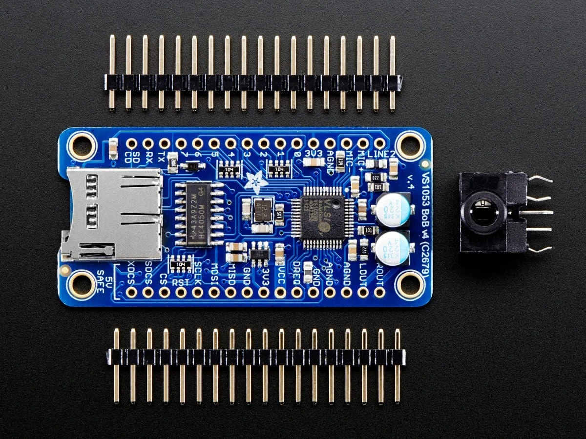 Each order comes with a fully assembled and tested breakout board, some 0.1″ male header you can solder to the breakout so it plugs into a breadboard and a bonus stereo headphone jack that will be handy when you want to plug headphones in!