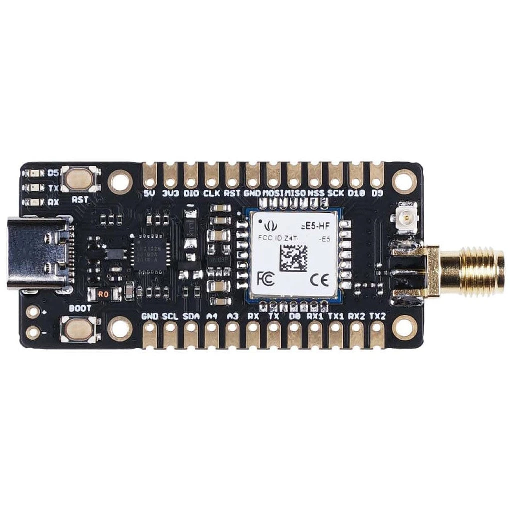 The board leads out all GPIOs of the Wio-E5, including UART, ADC, SPI and IIC. It contains RESET and BOOT buttons and is user-friendly. Supporting Long Range protocol, the Wio-E5 Mini features ultra-long-range transmission and ultra-low power consumption: it is able to achieve a transmission range of up to 10 km, and the sleep current of Wio-E5 modules on board is as low as 2.1 uA(WOR mode). It is designed with industrial standards with a wide working temperature at -40 ℃ ~ 85℃, high sensitivity between -116.5dBm ~ -136 dBm, and power output up to +20.8 dBm at 3.3V.